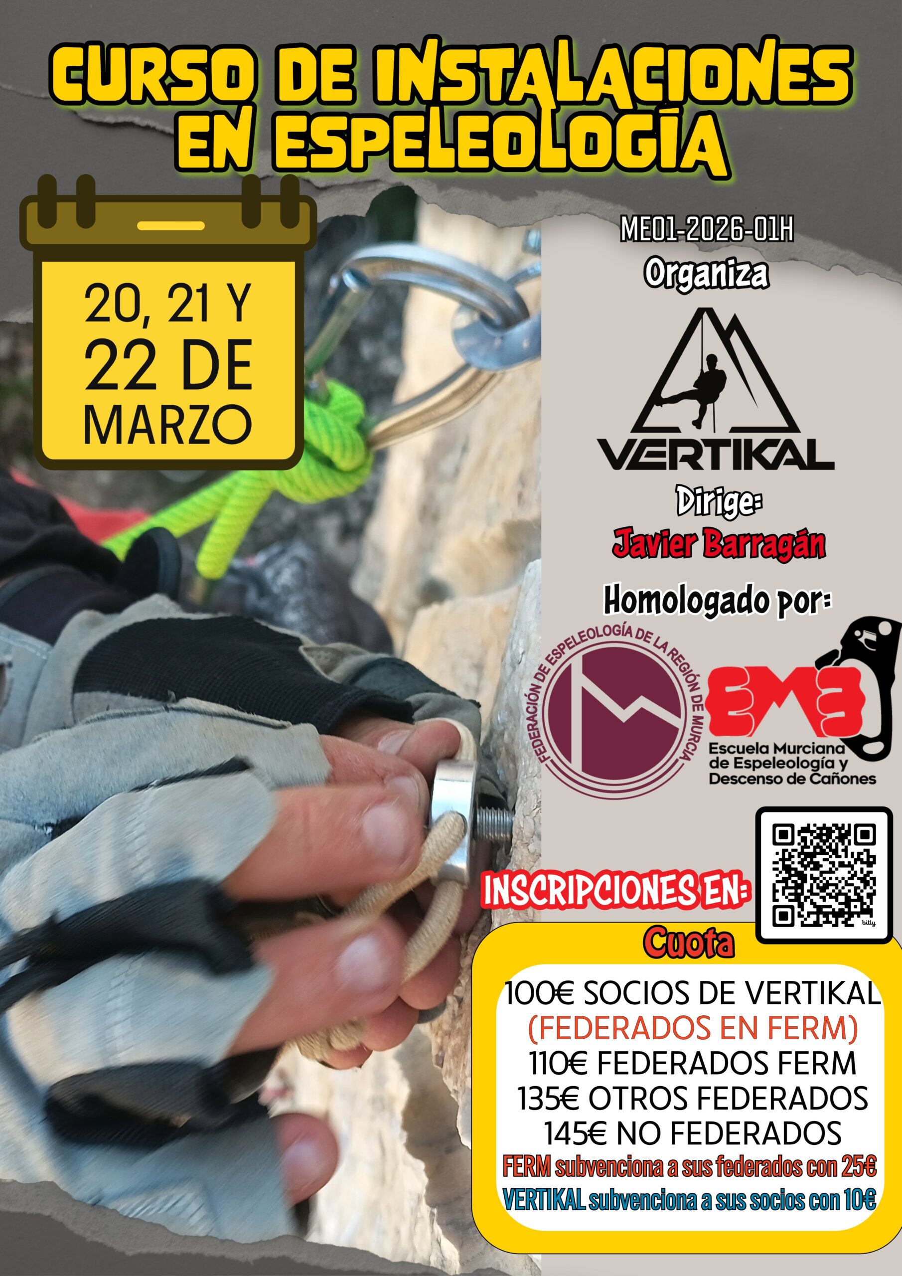 La cuota de matrícula del Curso es de 100 euros para socios del club vertikal con federativa emitida por FERM (Federación de Espeleología de la Región de Murcia), 110 euros para federados con federativa emitida por FERM (Federación de Espeleología de la Región de Murcia) 135 euros para federados con cobertura en actividades de espeleología de otras federaciones y 145€ aquellos que opten por seguro temporal (sin federativa con cobertura en espeleología). Como se puede observar, la Federación de Espeleología de la Región de Murcia beneficiará a sus federados con 25€ de subvención y Vertikal con 10€ a sus socios.