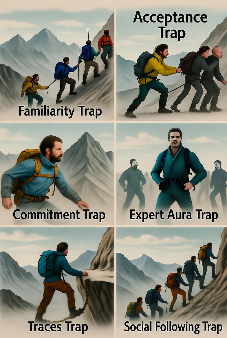 | SEGUIMIENTO SOCIAL Se suele dar en las personas con menos formación y experiencia. Asumen que lo que hace mi compañero es correcto. Los grupos cuando son más numerosos aparece la falsa sensación de “protección del rebaño” y se exponen más a los riesgos. | Es mejor ir en grupos mas pequeños. Las decisiones en conjunto deben de ser consensuadas con el grupo, y cada uno debe ser responsable de tomar sus propias decisiones. |